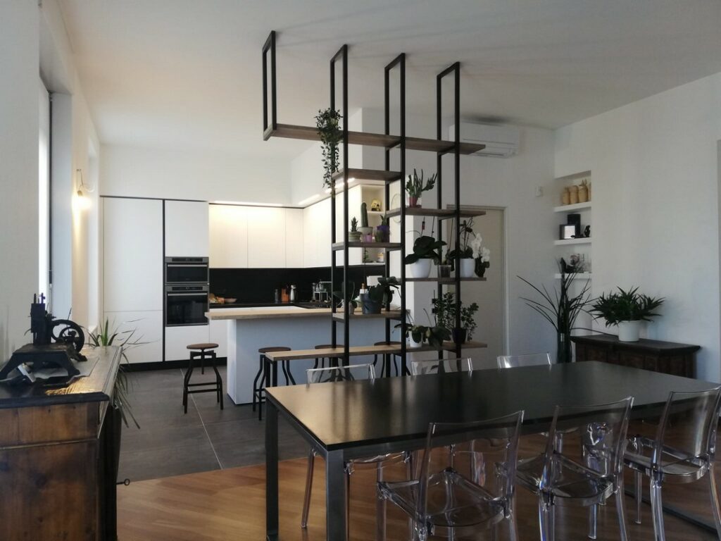 Da notare la libreria passante di Ferro Design che separa idealmente la cucina dalla zona pranzo.