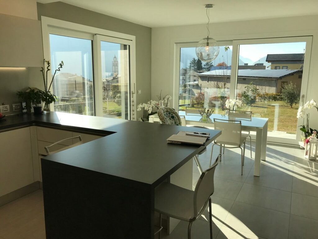Un ambiente moderno e arioso valorizza la composizione articolata della cucina con piano penisola. Da notare il ribassamento del soffitto in cartongesso e i giochi di luce realizzati.