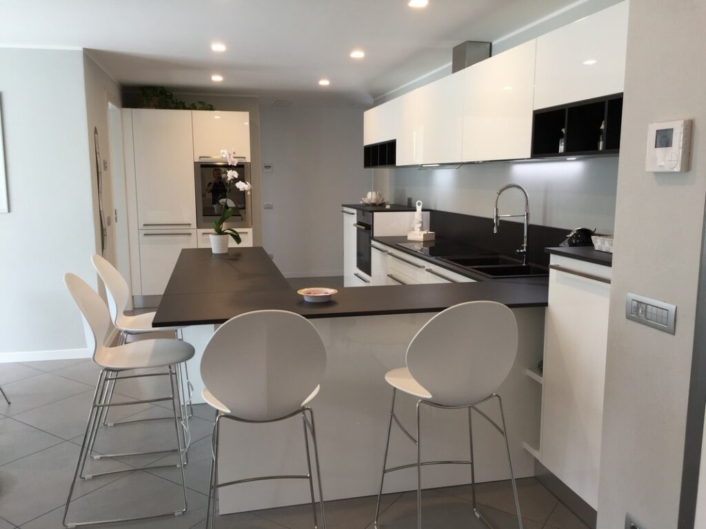 Cucina in laccato bianco con piano in Dekton, parete Tv personalizzata con Tapezzeria di Creative Space con un fantastico effetto ottico che amplia notevolmente lo spazio. Cameretta Nidi di Battistella…