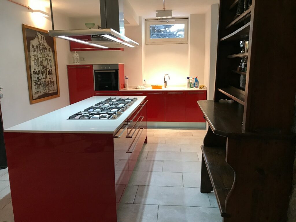 Questa è sicuramente una taverna anticonvenzionale! Tutta in laccato rosso lucido, piano lavoro in Decton bianco, isola centrale con piano cottura Domino di Franke e cappa squadrata, particolari di finitura inox.